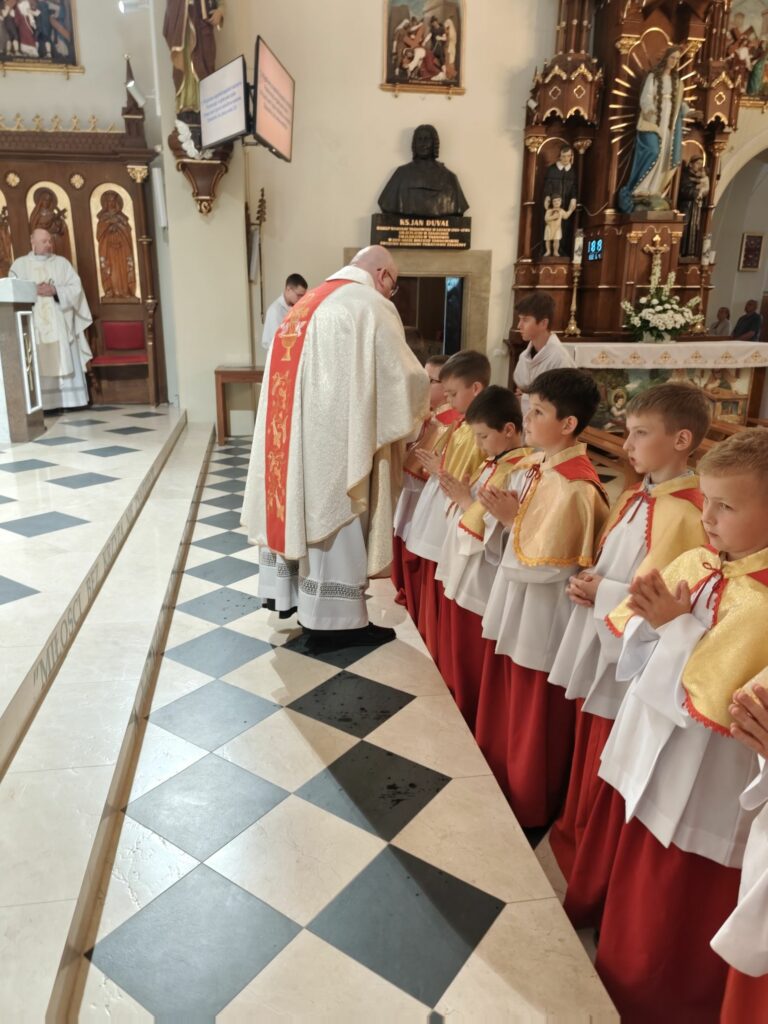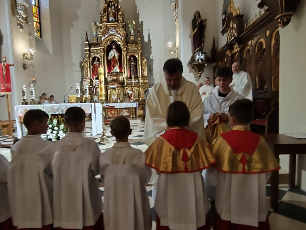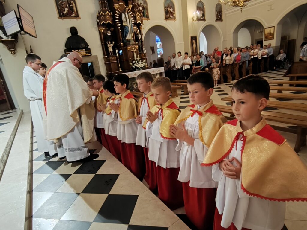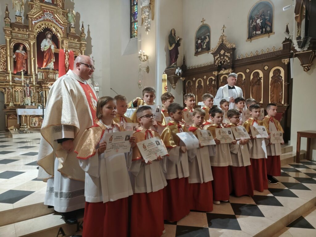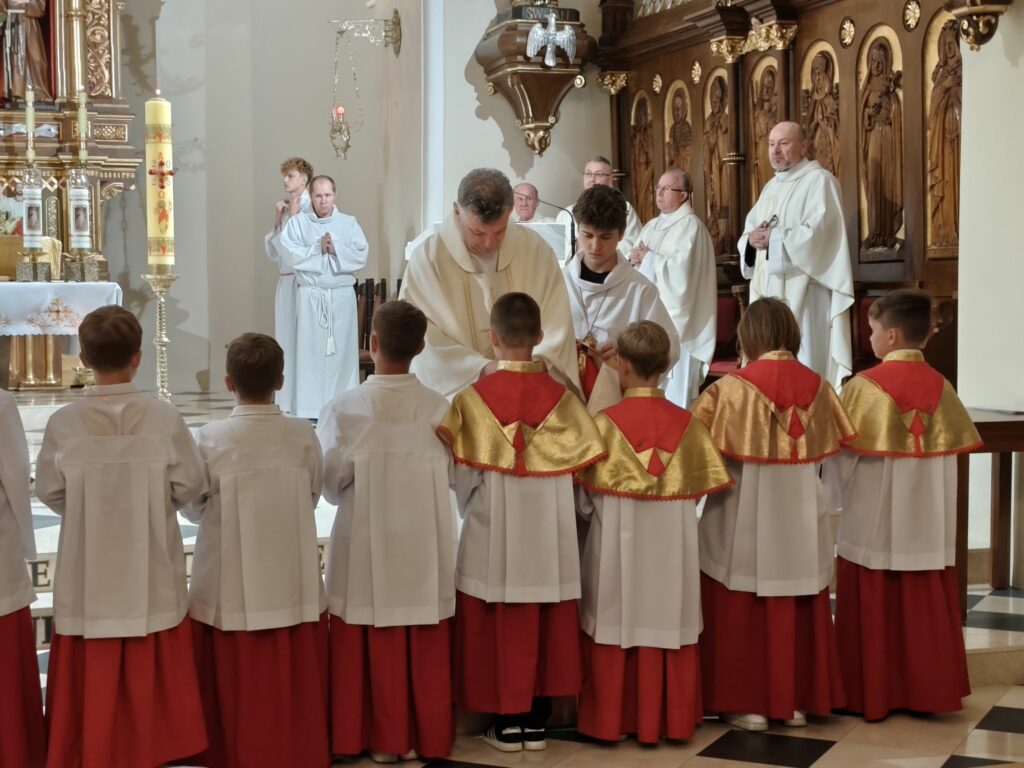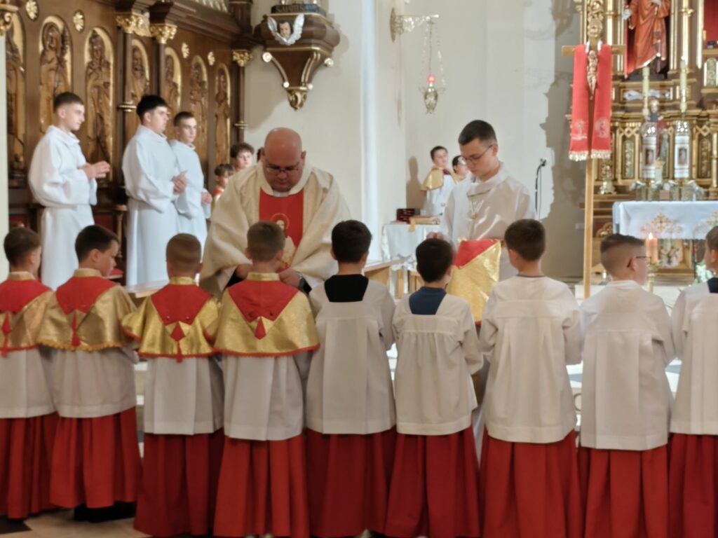 osoba posługująca w liturgii, najczęściej w czasie sprawowania Eucharystii, a także nabożeństw poza Mszą świętą. Podczas mszy świętej w dniu 4 czerwca 2025 roku celebrowanej przez: ks. Proboszcza Bogusława Pasierba, ks. Piotra Klóskę, ks. Jana Wąchałę, Ks. Mariusza Berko, ks. Roberta Osaka oraz ks. Jubilata Stanisława Szczygła, który w niedzielę świętował 50 – lecie Święceń Kapłańskich 17 chłopców z Bełdna, Bytomska, Rozdziela i Żegociny zostało przez proboszcza – ks. Bogusława Pasierba włączonych do ministranckiej służby. Byli to: Jakub Kokoszka, Adam Mirowski, Wojciech Kania, Wiktor Kowal, Tymon Dziedzic, Tomasz Mittman, Szymon Łyszczarz, Norbert Paczek, Maksymilian Staszak, Maksymilian Dziedzic, Łukasz Dudzic, Konrad Janiczek, Jan Ogiela, Igor Kaczmarczyk, Bartłomiej Kukla, Dawid Dziedzic, Dominik Obrzut – To wielki dar dla Parafii, Dziękuję Wam – Rodzice nowych ministrantów, że w Waszych domach jest klimat kościoła, klimat taki, że ci chłopcy mogą wstawać nieraz bardzo wcześnie rano, by stanąć przy ołtarzu. Gratuluję Wam Rodzice ! Kochani chłopcy – nowi ministranci ! Życzę Wam, byście się tu – przy ołtarzu – dobrze czuli, by każdy z Was mówił przy ołtarzu – dobrze mi tu być ! Całą parafię i wszystkich tu zgromadzonych proszę o modlitwę, by cała służba liturgiczna: lektorzy, ministranci, kantorzy – tu przy ołtarzu dobrze się czuli – mówił ks. Bogusław Pasierb – proboszcz parafii-, zwracając się do zebranych w kościele parafian. Podziękował również ks. Robertowi Osakowi – opiekunowi LSO. Każdemu z nowych ministrantów ksiądz proboszcz założył na ramiona pelerynkę, a ksiądz opiekun wręczył dyplomy Ministranta. Po tej uroczystości nowi ministranci będą mogli m. in. nosić krzyż i Świętą Księgę, dawać znaki dzwonkami, podawać dary ofiarne, nosić kadzidło i światło. Uroczystość zakończono wspólnym zdjęciem.