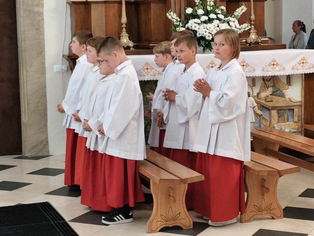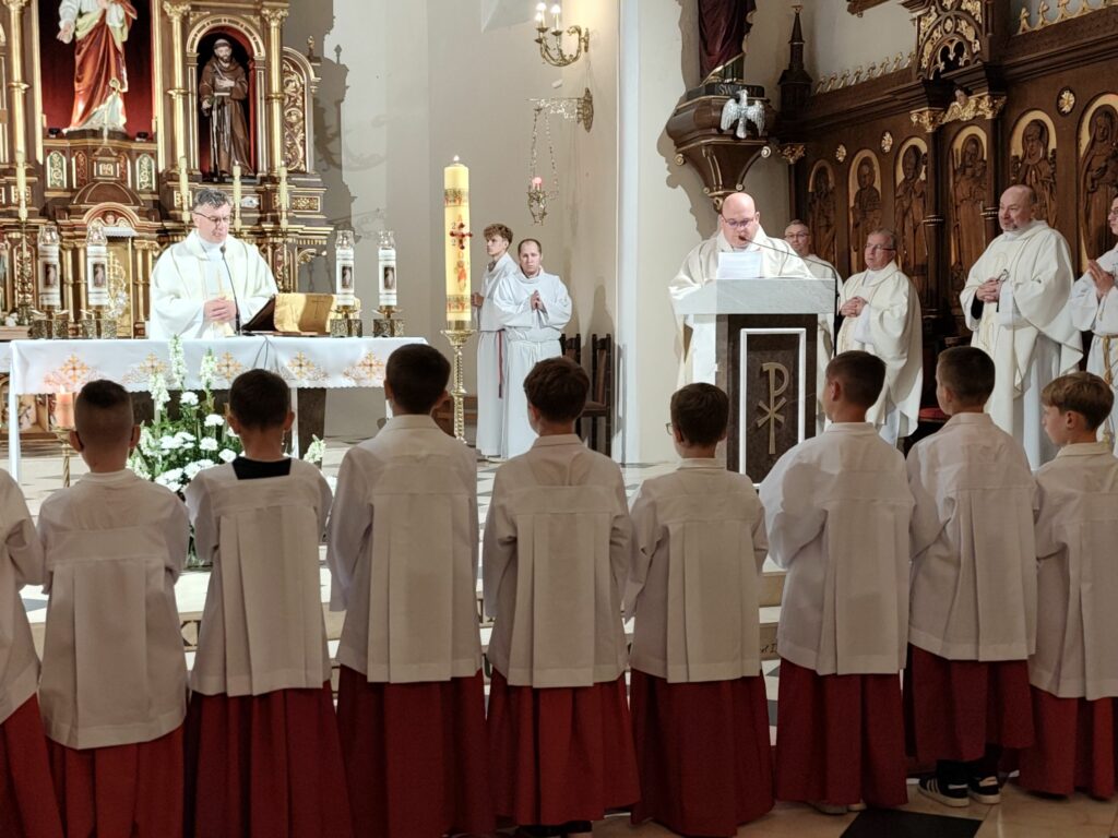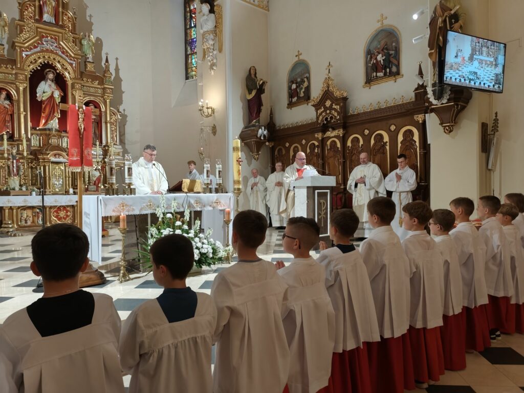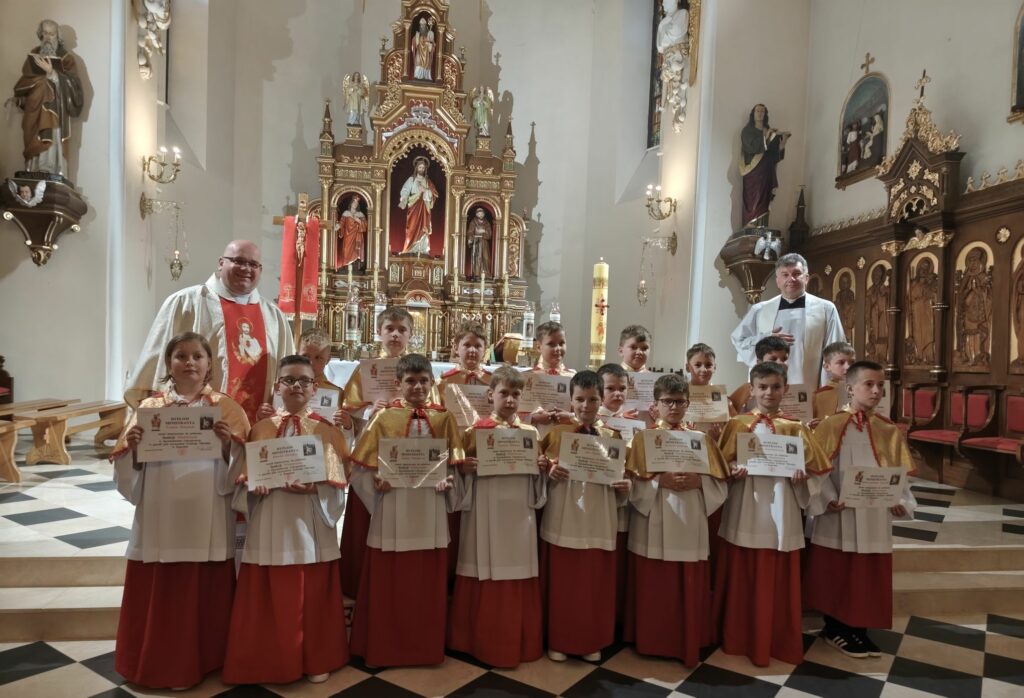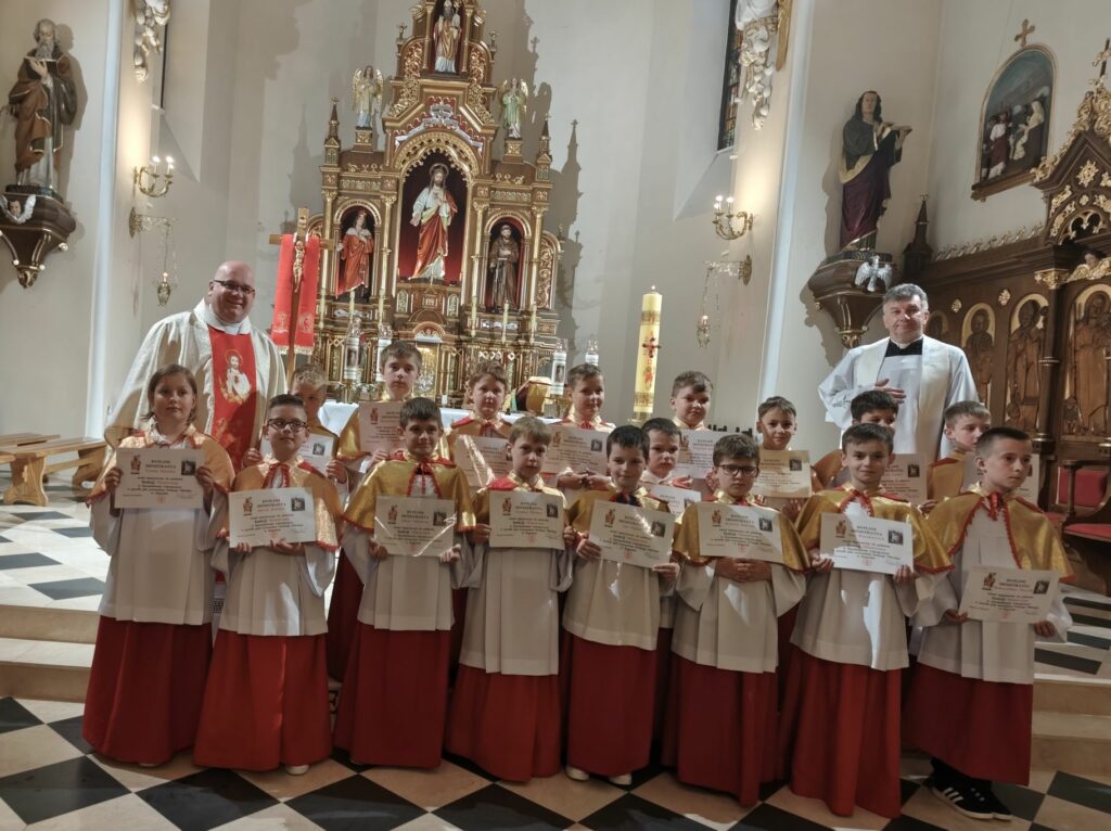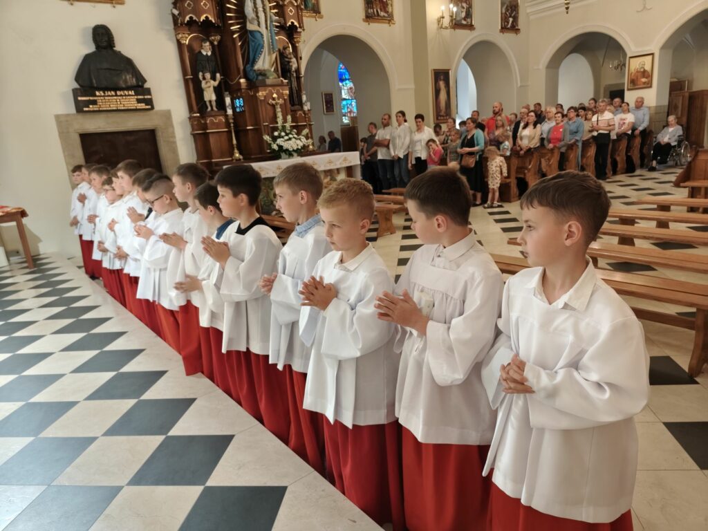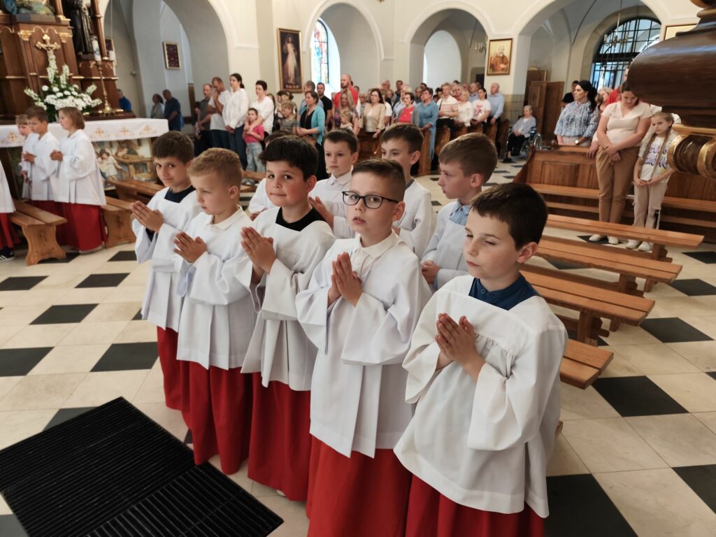 osoba posługująca w liturgii, najczęściej w czasie sprawowania Eucharystii, a także nabożeństw poza Mszą świętą. Podczas mszy świętej w dniu 4 czerwca 2025 roku celebrowanej przez: ks. Proboszcza Bogusława Pasierba, ks. Piotra Klóskę, ks. Jana Wąchałę, Ks. Mariusza Berko, ks. Roberta Osaka oraz ks. Jubilata Stanisława Szczygła, który w niedzielę świętował 50 – lecie Święceń Kapłańskich 17 chłopców z Bełdna, Bytomska, Rozdziela i Żegociny zostało przez proboszcza – ks. Bogusława Pasierba włączonych do ministranckiej służby. Byli to: Jakub Kokoszka, Adam Mirowski, Wojciech Kania, Wiktor Kowal, Tymon Dziedzic, Tomasz Mittman, Szymon Łyszczarz, Norbert Paczek, Maksymilian Staszak, Maksymilian Dziedzic, Łukasz Dudzic, Konrad Janiczek, Jan Ogiela, Igor Kaczmarczyk, Bartłomiej Kukla, Dawid Dziedzic, Dominik Obrzut – To wielki dar dla Parafii, Dziękuję Wam – Rodzice nowych ministrantów, że w Waszych domach jest klimat kościoła, klimat taki, że ci chłopcy mogą wstawać nieraz bardzo wcześnie rano, by stanąć przy ołtarzu. Gratuluję Wam Rodzice ! Kochani chłopcy – nowi ministranci ! Życzę Wam, byście się tu – przy ołtarzu – dobrze czuli, by każdy z Was mówił przy ołtarzu – dobrze mi tu być ! Całą parafię i wszystkich tu zgromadzonych proszę o modlitwę, by cała służba liturgiczna: lektorzy, ministranci, kantorzy – tu przy ołtarzu dobrze się czuli – mówił ks. Bogusław Pasierb – proboszcz parafii-, zwracając się do zebranych w kościele parafian. Podziękował również ks. Robertowi Osakowi – opiekunowi LSO. Każdemu z nowych ministrantów ksiądz proboszcz założył na ramiona pelerynkę, a ksiądz opiekun wręczył dyplomy Ministranta. Po tej uroczystości nowi ministranci będą mogli m. in. nosić krzyż i Świętą Księgę, dawać znaki dzwonkami, podawać dary ofiarne, nosić kadzidło i światło. Uroczystość zakończono wspólnym zdjęciem.