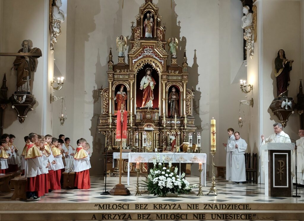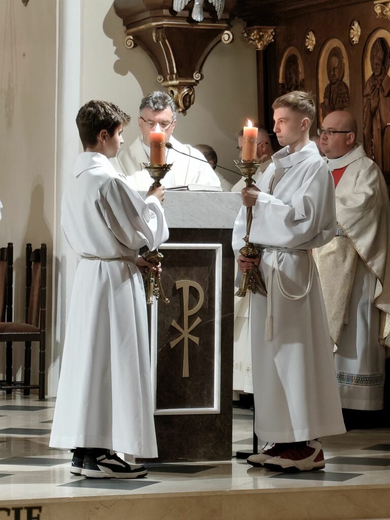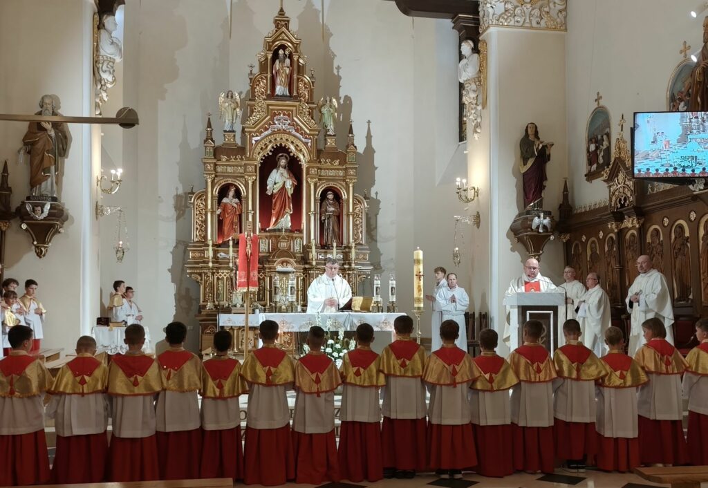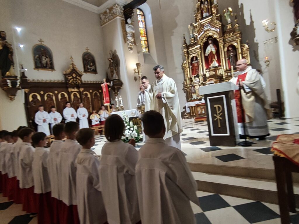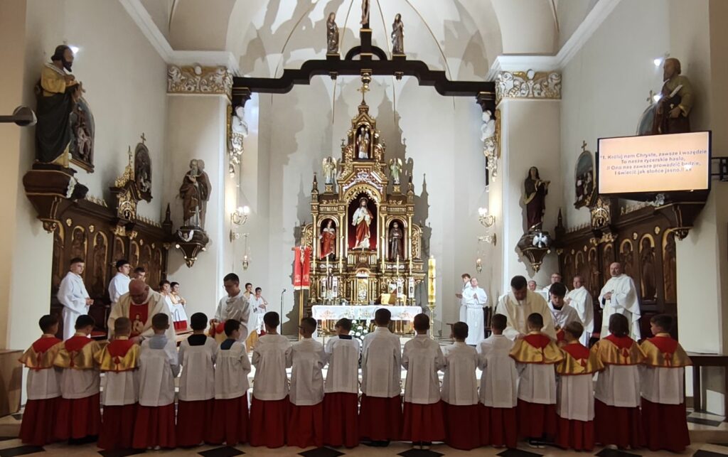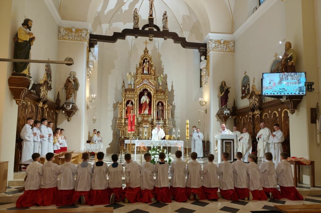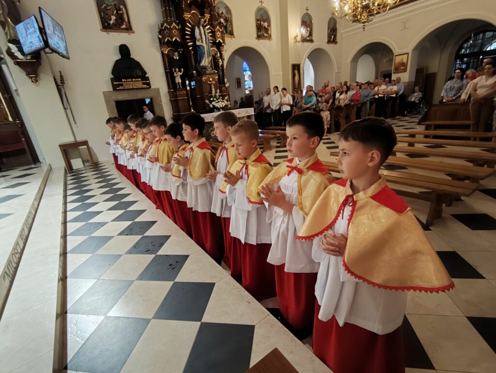osoba posługująca w liturgii, najczęściej w czasie sprawowania Eucharystii, a także nabożeństw poza Mszą świętą. Podczas mszy świętej w dniu 4 czerwca 2025 roku celebrowanej przez: ks. Proboszcza Bogusława Pasierba, ks. Piotra Klóskę, ks. Jana Wąchałę, Ks. Mariusza Berko, ks. Roberta Osaka oraz ks. Jubilata Stanisława Szczygła, który w niedzielę świętował 50 – lecie Święceń Kapłańskich 17 chłopców z Bełdna, Bytomska, Rozdziela i Żegociny zostało przez proboszcza – ks. Bogusława Pasierba włączonych do ministranckiej służby. Byli to: Jakub Kokoszka, Adam Mirowski, Wojciech Kania, Wiktor Kowal, Tymon Dziedzic, Tomasz Mittman, Szymon Łyszczarz, Norbert Paczek, Maksymilian Staszak, Maksymilian Dziedzic, Łukasz Dudzic, Konrad Janiczek, Jan Ogiela, Igor Kaczmarczyk, Bartłomiej Kukla, Dawid Dziedzic, Dominik Obrzut – To wielki dar dla Parafii, Dziękuję Wam – Rodzice nowych ministrantów, że w Waszych domach jest klimat kościoła, klimat taki, że ci chłopcy mogą wstawać nieraz bardzo wcześnie rano, by stanąć przy ołtarzu. Gratuluję Wam Rodzice ! Kochani chłopcy – nowi ministranci ! Życzę Wam, byście się tu – przy ołtarzu – dobrze czuli, by każdy z Was mówił przy ołtarzu – dobrze mi tu być ! Całą parafię i wszystkich tu zgromadzonych proszę o modlitwę, by cała służba liturgiczna: lektorzy, ministranci, kantorzy – tu przy ołtarzu dobrze się czuli – mówił ks. Bogusław Pasierb – proboszcz parafii-, zwracając się do zebranych w kościele parafian. Podziękował również ks. Robertowi Osakowi – opiekunowi LSO. Każdemu z nowych ministrantów ksiądz proboszcz założył na ramiona pelerynkę, a ksiądz opiekun wręczył dyplomy Ministranta. Po tej uroczystości nowi ministranci będą mogli m. in. nosić krzyż i Świętą Księgę, dawać znaki dzwonkami, podawać dary ofiarne, nosić kadzidło i światło. Uroczystość zakończono wspólnym zdjęciem.