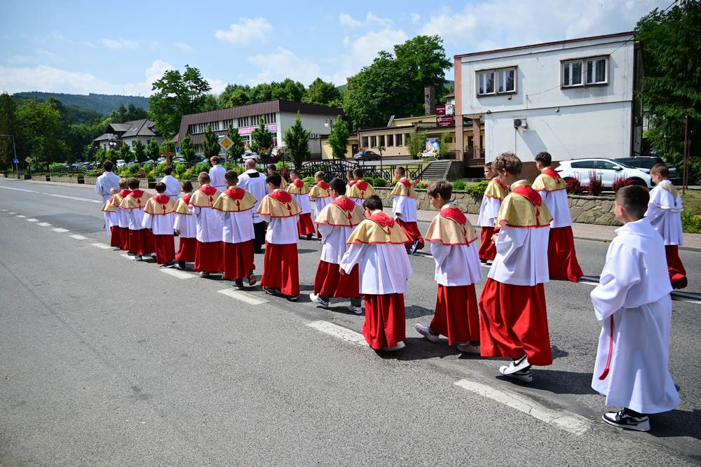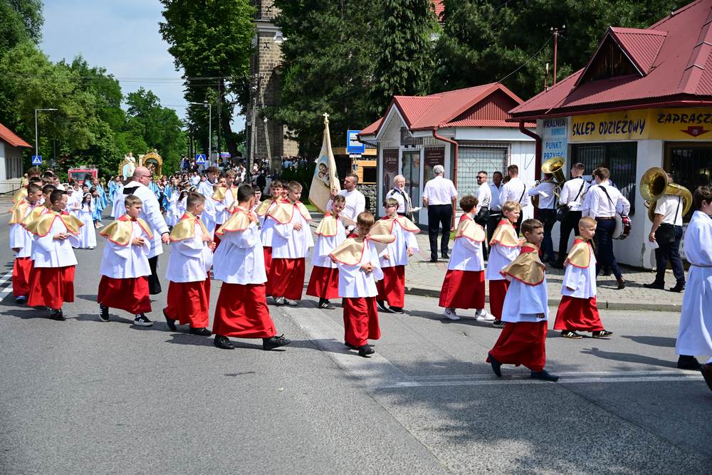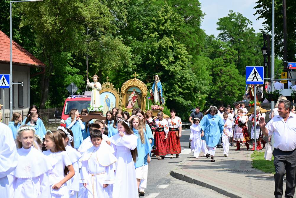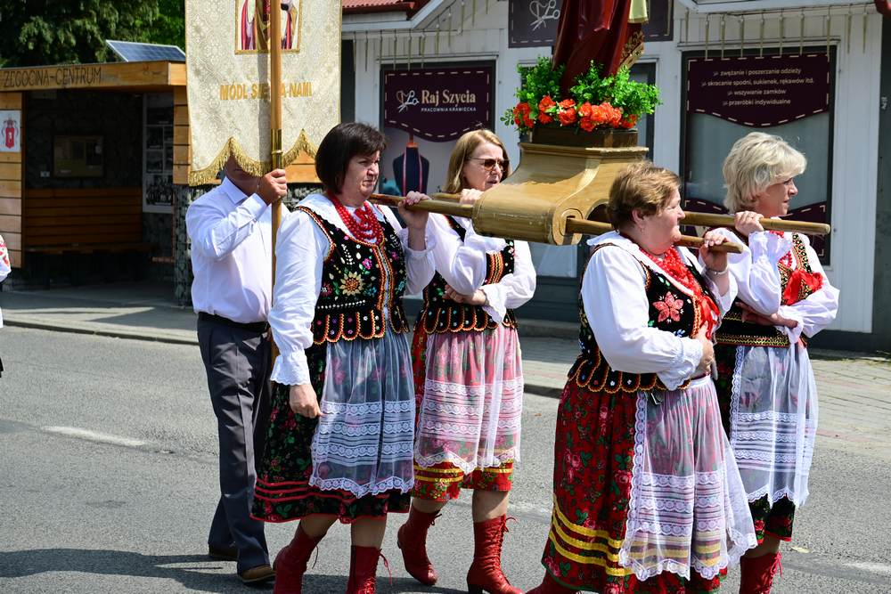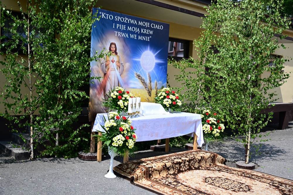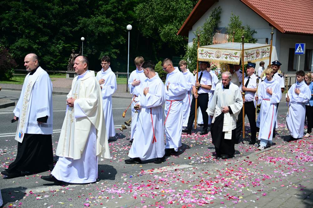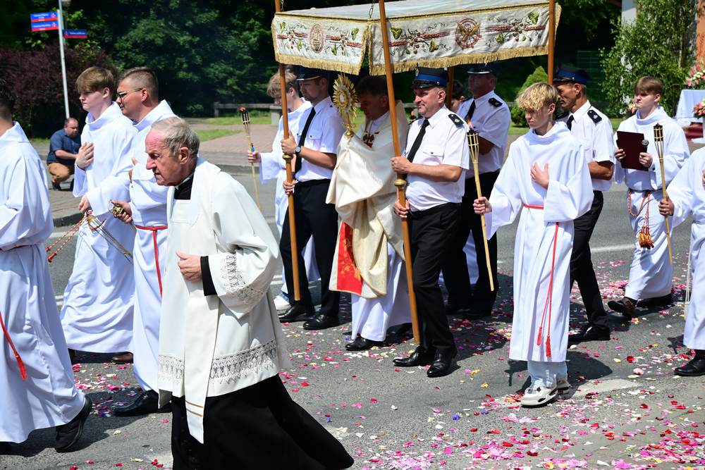 który w tym roku wypadł na 19 czerwca, została odprawiona o godz. 10.00 w koncelebrze pod przewodnictwem ks. Proboszcza Bogusława Pasierba w asyście wystąpił: ks. Jan Wąchała, ks. Mariusz Berko, ks. Józef Cempura. Boże Ciało jest to jedno z najważniejszych świąt katolickich, w czasie którego wierni wyznają wiarę w obecność Jezusa Chrystusa w Najświętszym Sakramencie. Po liturgii eucharystycznej następuje procesja do czterech ołtarzy. Przy każdym z nich odmawia się modlitwy i czyta ewangelię. Na zakończenie procesji kapłan udziela wiernym błogosławieństwa. Boże Ciało to święto ruchome, które przypada zawsze 60 dni po Wielkanocy. W Polsce obchodzi się je w czwartek po Uroczystości Trójcy Świętej. Cztery ołtarze symbolizują czterech Ewangelistów i cztery strony świata. Po zakończeniu mszy świętej i wystawieniu Najświętszego Sakramentu z kościoła wyszła procesja, zabezpieczana przez strażaków OSP w Żegocinie, którzy także nieśli baldachim oraz wspólnie z druhami z OSP w Bełdnie i OSP w Bytomsku asystowali w strażackim pododdziale. Przy dźwiękach dzwonów, muzyce Orkiestry Dętej CKSiT w Żegocinie pod batutą Pana Mieczysława Kędry, ze śpiewem na ustach barwny orszak procesyjny przemierzał trasę do ustawionych, w tych samych miejscach, co w latach poprzednich, czterech ołtarzy, przygotowanych kolejno przez parafian z Bełdna, Rozdziela, Bytomska i Żegociny. Obecne były dzieci pierwszokomunijne ubrane w białe stroje, dziewczynki w krakowskich strojach sypiące wielobarwne kwiaty, chłopcy w komeżkach z czerwonymi pelerynkami dzwoniący małymi dzwonkami. Niesiono kościelne chorągwie i feretrony oraz figurę Matki Bożej Fatimskiej. Przy każdym z ołtarzy, kapłani czytali fragmenty poszczególnych Ewangelii. Śpiewano suplikacje, hymn „Ciebie Boga wysławiamy”, a na zakończenie ks. Bogusław Pasierb pobłogosławił uczestników procesji Najświętszym Sakramentem. Na zakończenie podziękował za przygotowanie ołtarzy, zabezpieczenie ruchu drogowego, za udział w procesji i jej uświetnienie przez orkiestrę, strażaków i dzieci. Procesje w kolejne dni odbywać się będą wokół kościoła. Zapraszamy do galerii zdjęć.