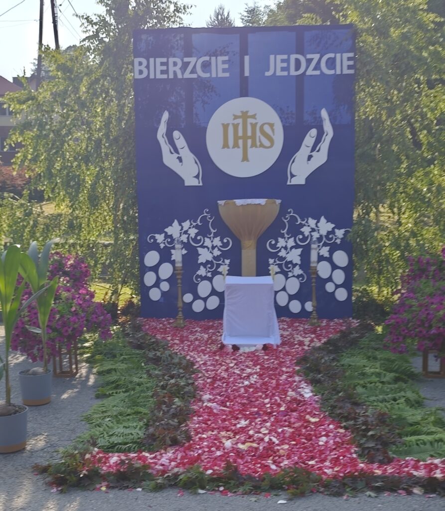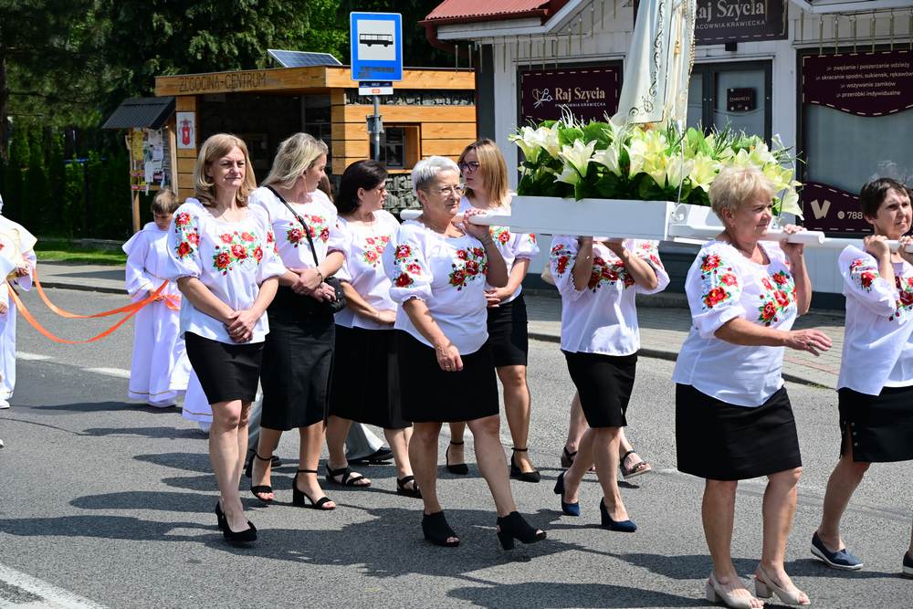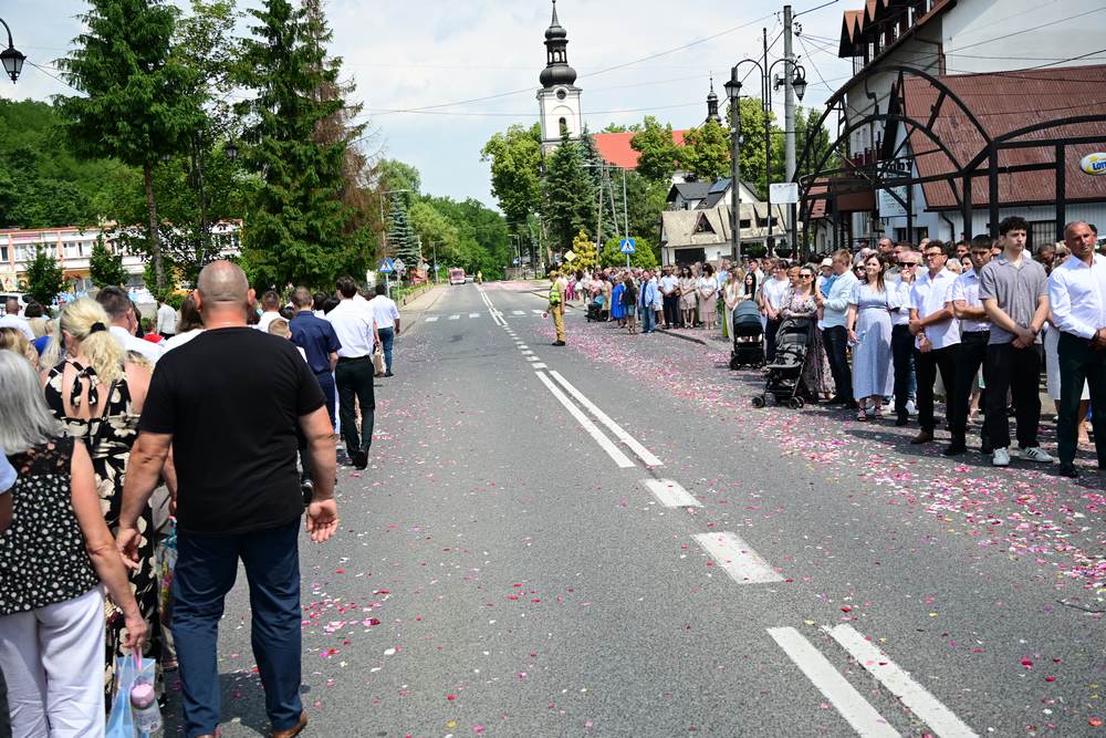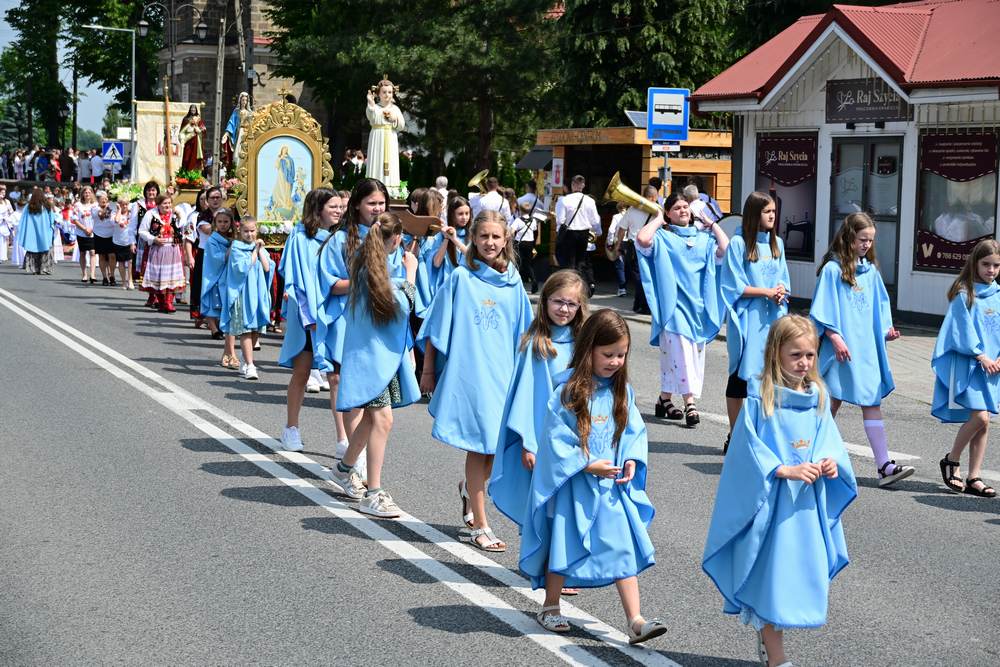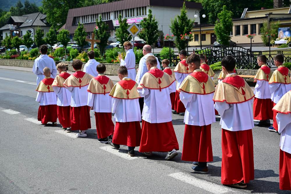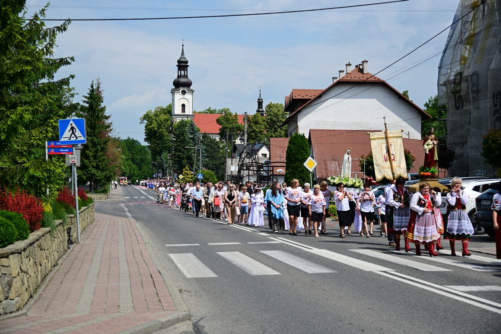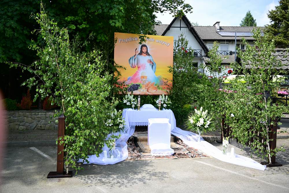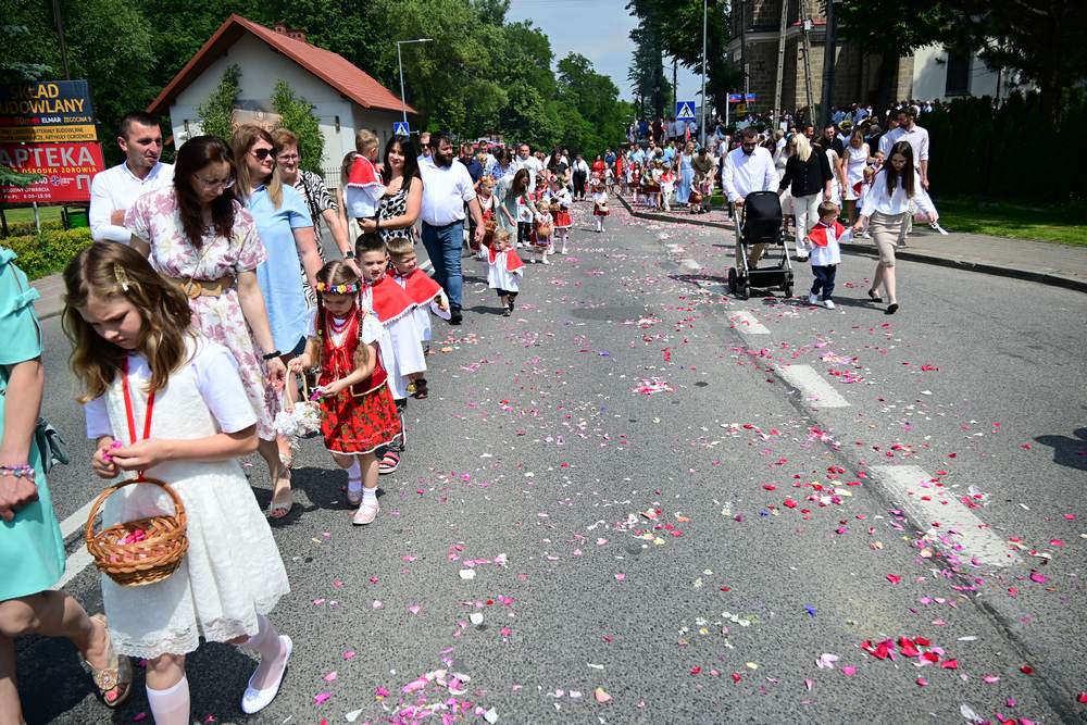 który w tym roku wypadł na 19 czerwca, została odprawiona o godz. 10.00 w koncelebrze pod przewodnictwem ks. Proboszcza Bogusława Pasierba w asyście wystąpił: ks. Jan Wąchała, ks. Mariusz Berko, ks. Józef Cempura. Boże Ciało jest to jedno z najważniejszych świąt katolickich, w czasie którego wierni wyznają wiarę w obecność Jezusa Chrystusa w Najświętszym Sakramencie. Po liturgii eucharystycznej następuje procesja do czterech ołtarzy. Przy każdym z nich odmawia się modlitwy i czyta ewangelię. Na zakończenie procesji kapłan udziela wiernym błogosławieństwa. Boże Ciało to święto ruchome, które przypada zawsze 60 dni po Wielkanocy. W Polsce obchodzi się je w czwartek po Uroczystości Trójcy Świętej. Cztery ołtarze symbolizują czterech Ewangelistów i cztery strony świata. Po zakończeniu mszy świętej i wystawieniu Najświętszego Sakramentu z kościoła wyszła procesja, zabezpieczana przez strażaków OSP w Żegocinie, którzy także nieśli baldachim oraz wspólnie z druhami z OSP w Bełdnie i OSP w Bytomsku asystowali w strażackim pododdziale. Przy dźwiękach dzwonów, muzyce Orkiestry Dętej CKSiT w Żegocinie pod batutą Pana Mieczysława Kędry, ze śpiewem na ustach barwny orszak procesyjny przemierzał trasę do ustawionych, w tych samych miejscach, co w latach poprzednich, czterech ołtarzy, przygotowanych kolejno przez parafian z Bełdna, Rozdziela, Bytomska i Żegociny. Obecne były dzieci pierwszokomunijne ubrane w białe stroje, dziewczynki w krakowskich strojach sypiące wielobarwne kwiaty, chłopcy w komeżkach z czerwonymi pelerynkami dzwoniący małymi dzwonkami. Niesiono kościelne chorągwie i feretrony oraz figurę Matki Bożej Fatimskiej. Przy każdym z ołtarzy, kapłani czytali fragmenty poszczególnych Ewangelii. Śpiewano suplikacje, hymn „Ciebie Boga wysławiamy”, a na zakończenie ks. Bogusław Pasierb pobłogosławił uczestników procesji Najświętszym Sakramentem. Na zakończenie podziękował za przygotowanie ołtarzy, zabezpieczenie ruchu drogowego, za udział w procesji i jej uświetnienie przez orkiestrę, strażaków i dzieci. Procesje w kolejne dni odbywać się będą wokół kościoła. Zapraszamy do galerii zdjęć.