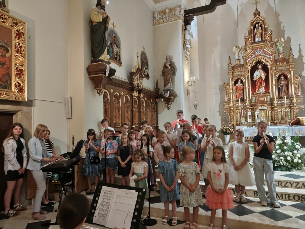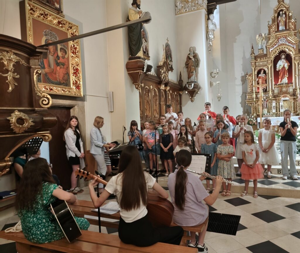 Schola udaje się na wakacje. Na zajęcia zespołu uczęszczały dzieci w wieku 6-12 lat. Scholę prowadzi Pani Organistka Małgorzata Świątko. Próby odbywały się we czwartki po wieczornej Mszy św. w salce na plebanii. Scholę przez cały rok pracy wspierał młodzieżowy zespół muzyczny.