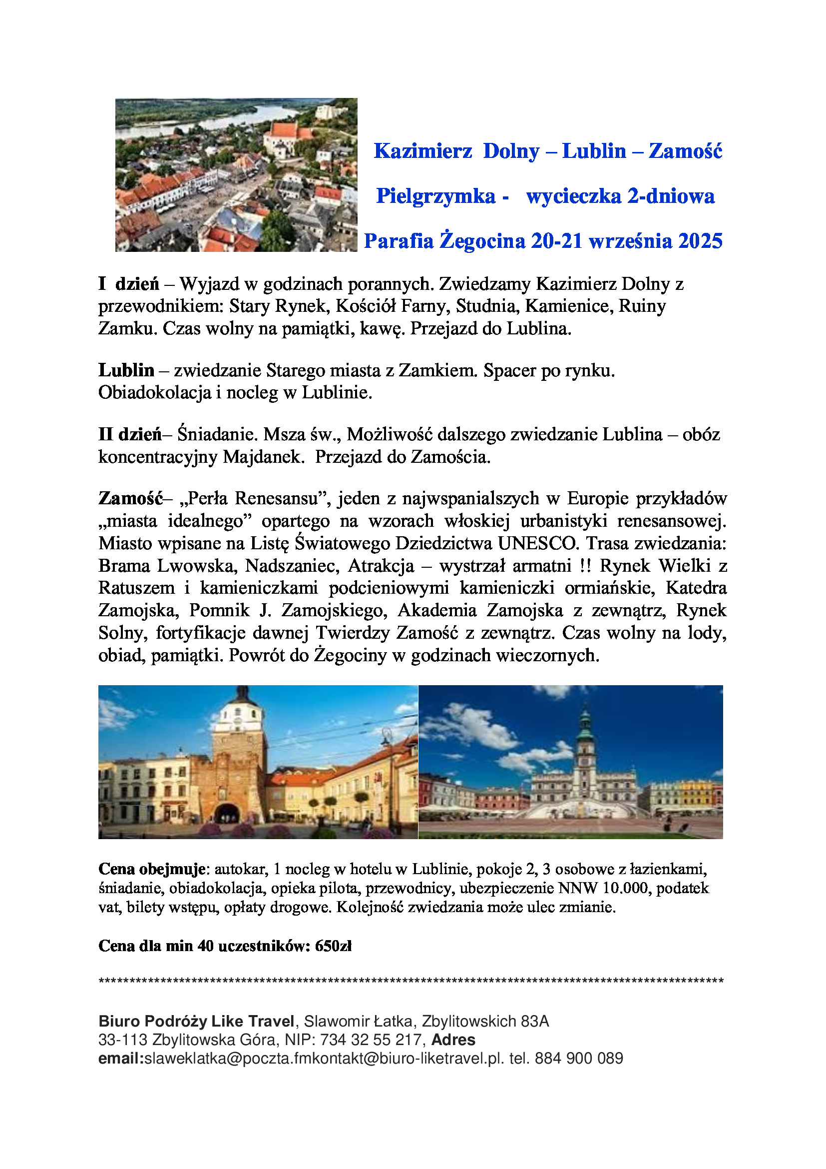 Kazimierz Dolny, Lublin, Zamość – Pielgrzymka – wycieczka 2-dniowa Parafia Żegocina 20-21 września 2025