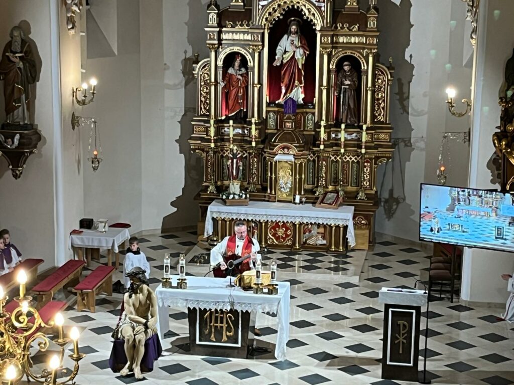 Dawniej odbywała się ona w Wielki Piątek, od kilku lat parafianie podążają Drogą Krzyżową tydzień wcześniej. Tak też miało być w tym roku 27 marca 2026 r. niestety śnieżna pogoda nie pozwoliła na to. Droga krzyżowa odbyła się więc w kościele,   Rozważania poszczególnych stacji czytali  jak zwykle przedstawiciele społeczności szkół z terenu parafii. Kolejne stacje zapowiadał ks. Piotr, który też razem z P. Organistką zadbał o oprawę muzyczną, grając na gitarze kilka pieśni wielkopostnych. Wszyscy uczestniczący w tej drodze mogli ją głęboko przeżyć. Następna dopiero za rok. Dziękujemy wszystkim, którzy pomogli zorganizować to nabożeństwo!