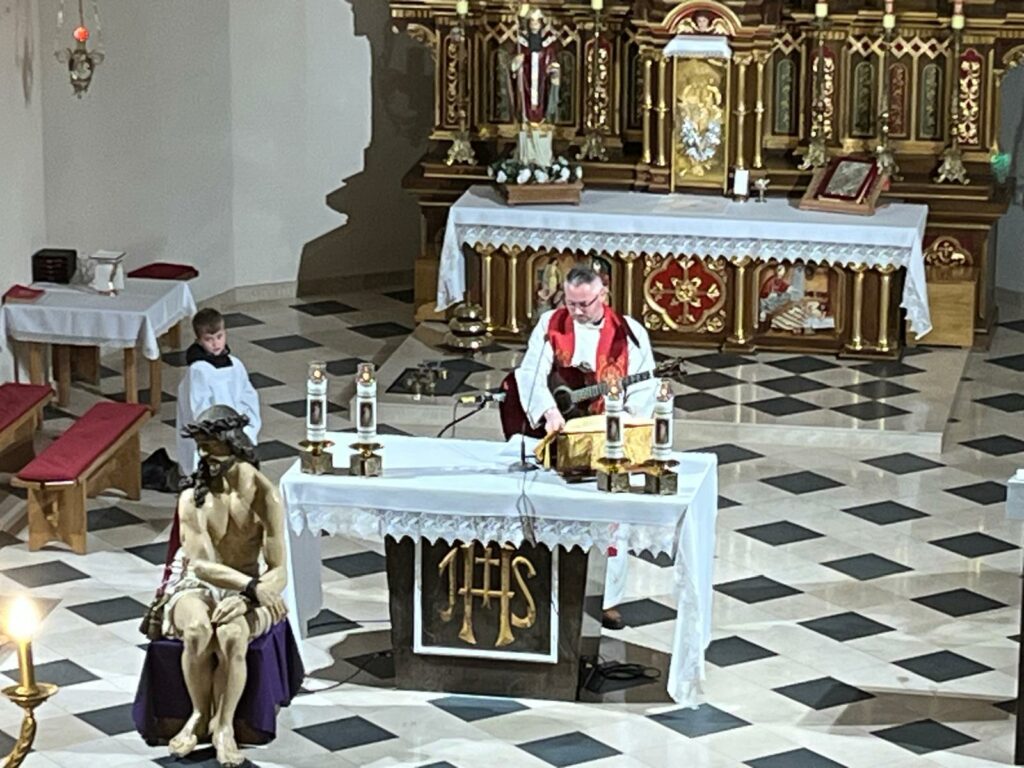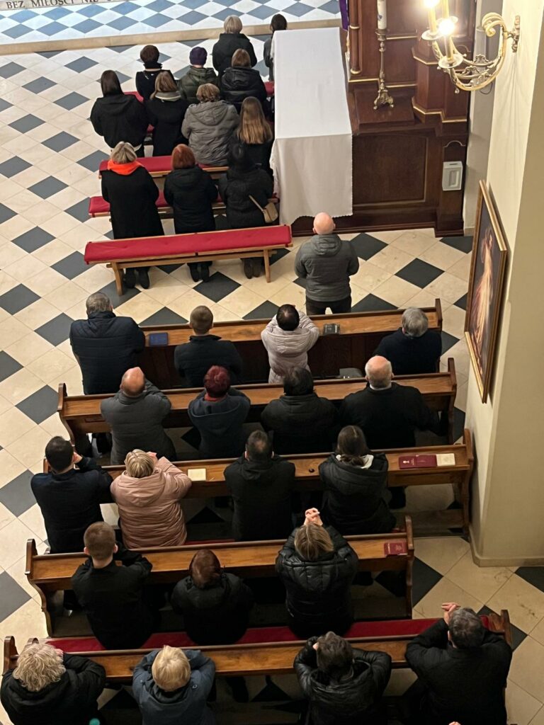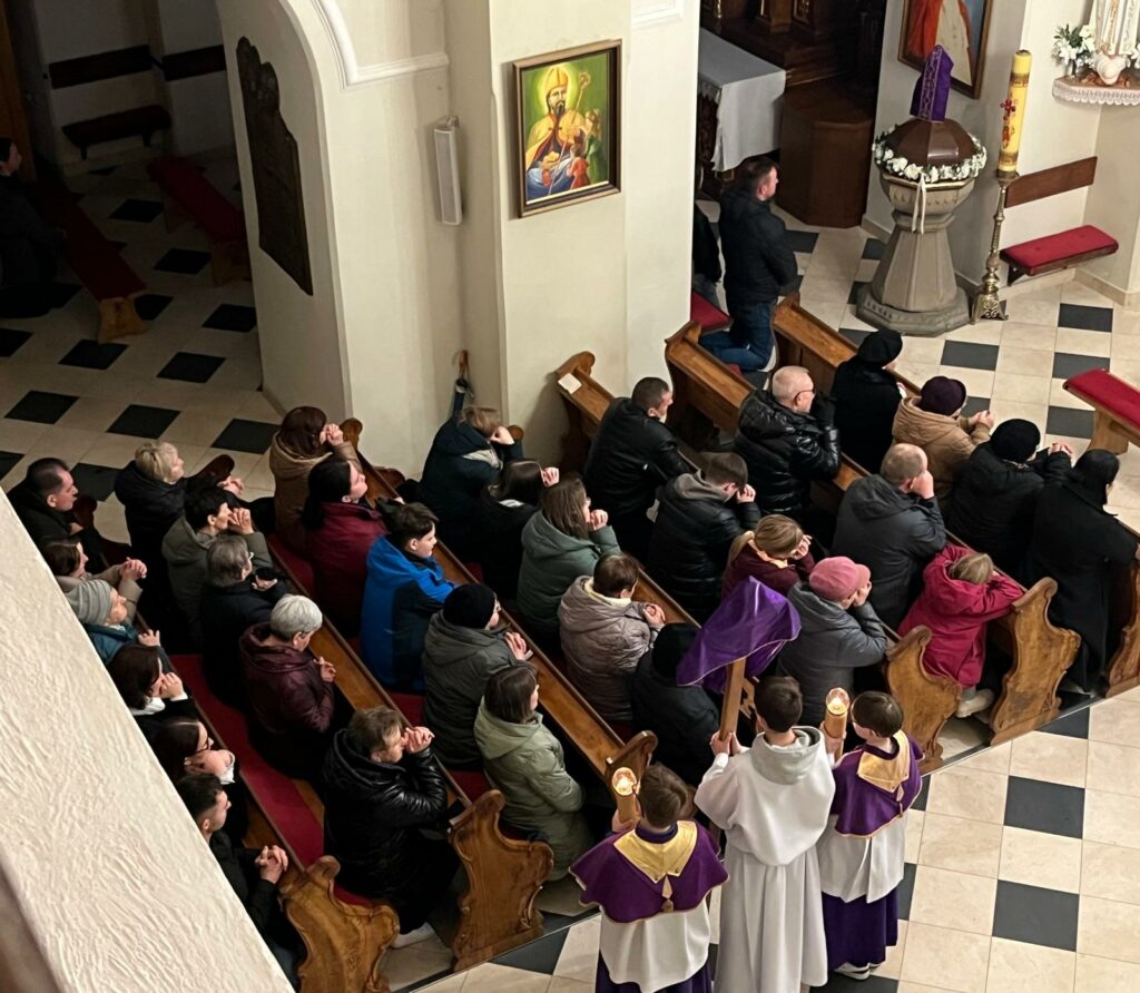 Dawniej odbywała się ona w Wielki Piątek, od kilku lat parafianie podążają Drogą Krzyżową tydzień wcześniej. Tak też miało być w tym roku 27 marca 2026 r. niestety śnieżna pogoda nie pozwoliła na to. Droga krzyżowa odbyła się więc w kościele,   Rozważania poszczególnych stacji czytali  jak zwykle przedstawiciele społeczności szkół z terenu parafii. Kolejne stacje zapowiadał ks. Piotr, który też razem z P. Organistką zadbał o oprawę muzyczną, grając na gitarze kilka pieśni wielkopostnych. Wszyscy uczestniczący w tej drodze mogli ją głęboko przeżyć. Następna dopiero za rok. Dziękujemy wszystkim, którzy pomogli zorganizować to nabożeństwo!