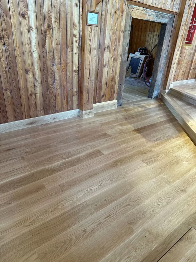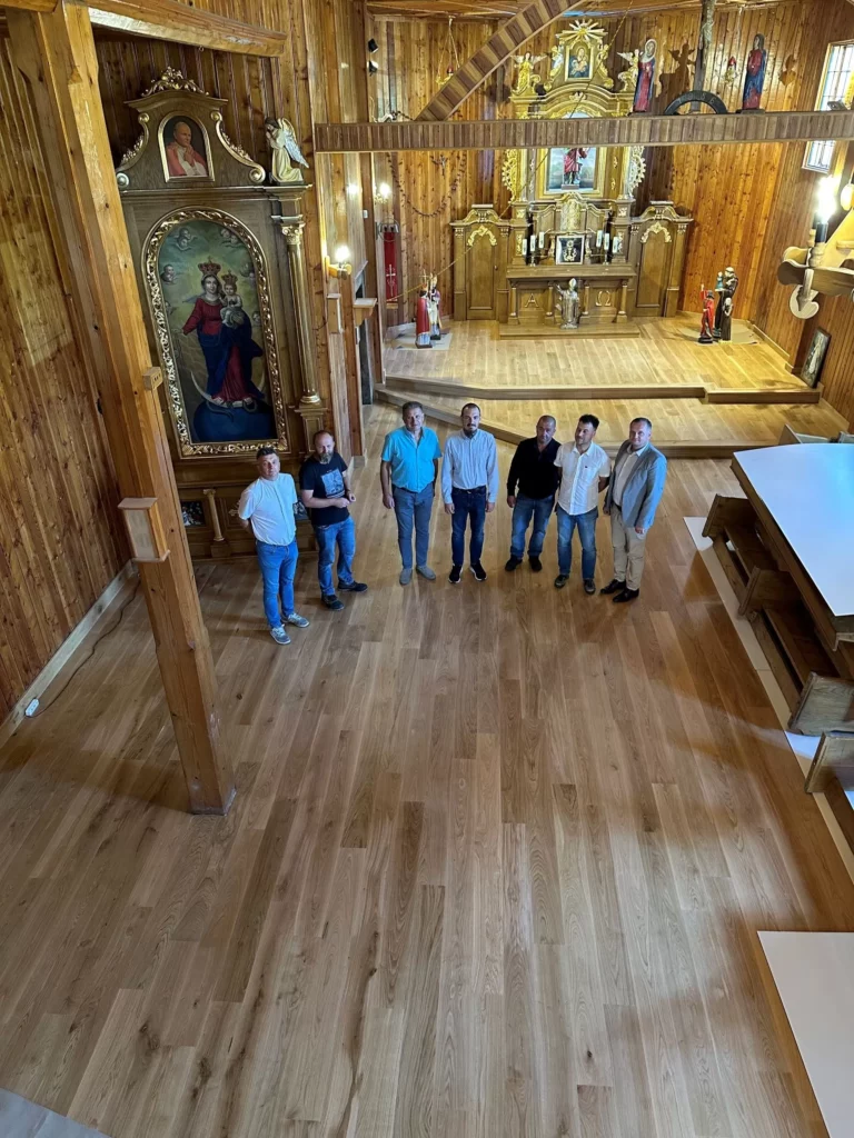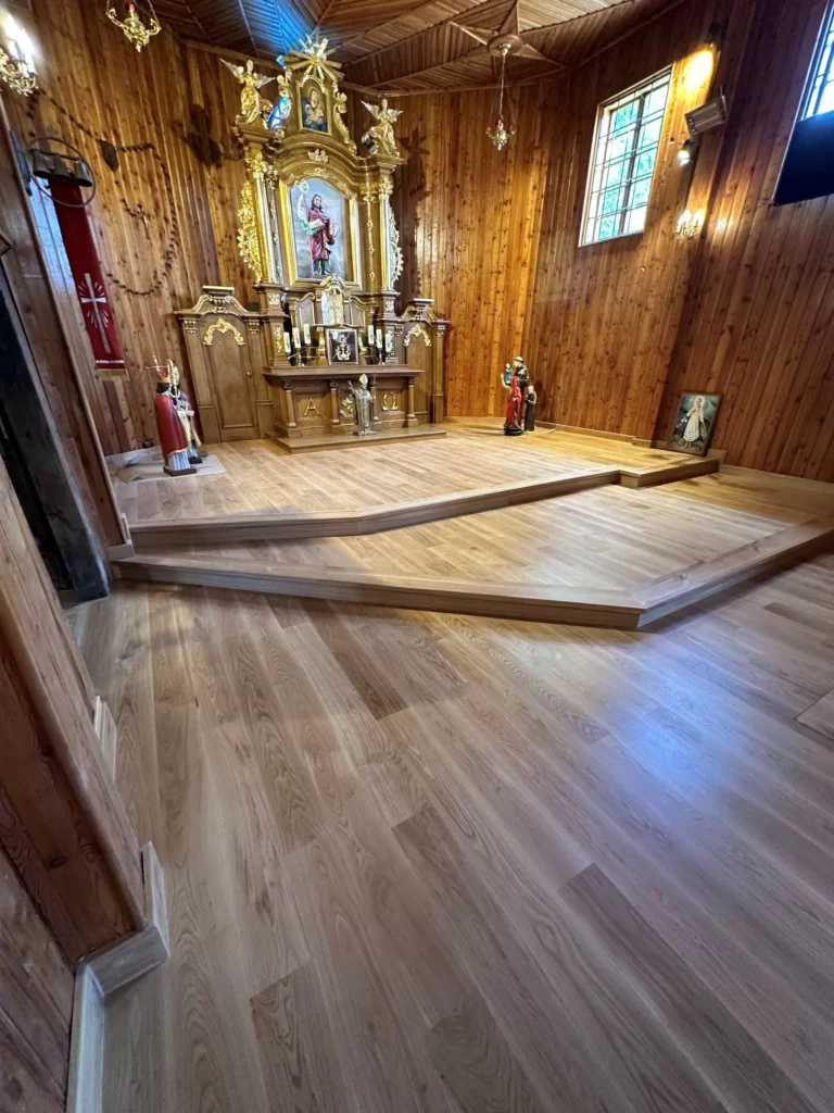 – wymianę drewnianej posadzki na deski dębowe w głównej nawie, prezbiterium, kaplicy bocznej, zakrystii, przedsionku i chórach,