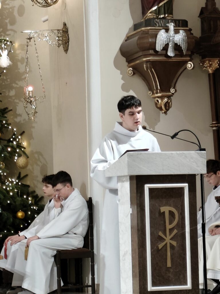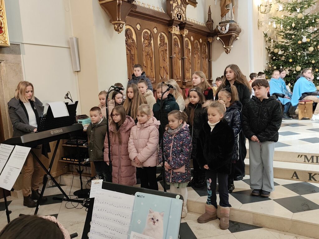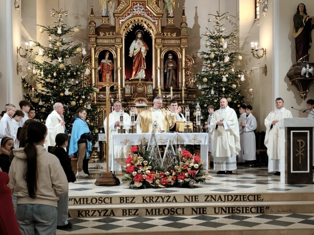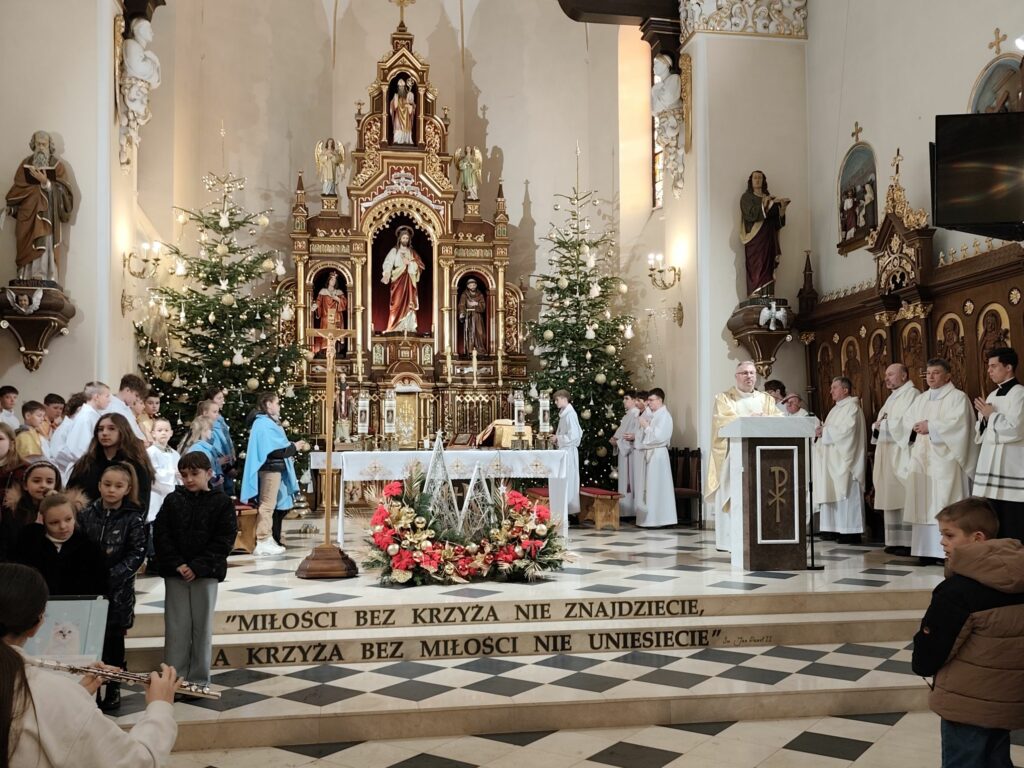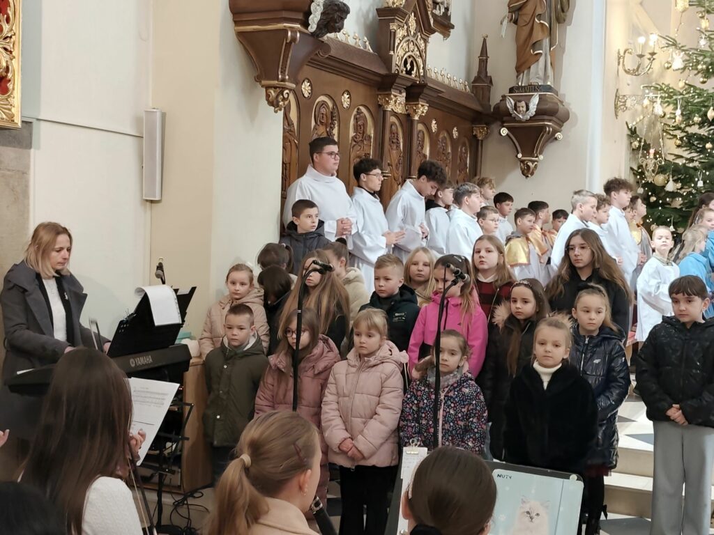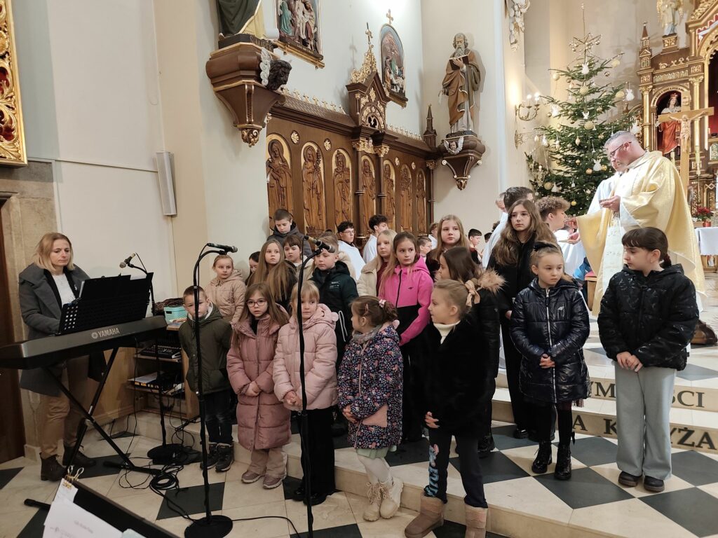 W niedzielę 4 stycznia 2026r. pierwszy raz w tym roku kalendarzowym w czasie mszy św. o godz. 11.00 celebrowanej przez: ks. Proboszcza Bogusława Pasierba, ks. Zbigniewa Kepę, ks. Piotra Klóskę, ks. Mariusza Berko, ks. Jana Wąchałę zaśpiewała Schola Parafialna prowadzona przez Panią Małgorzatę Świątko. W czasie nabożeństwa pięknie wybrzmiały kolędy i pastorałki. Scholę przez cały rok pracy wspiera młodzieżowy zespół muzyczny w składzie: Karolina Błoniarz ( skrzypce), Urszula Krawczyk ( skrzypce), Oliwia Smoleń ( skrzypce), Marysia Sroka ( gitara), Milena Duś (gitara), Natalia Kępa. ( gitara) Magda Stach. ( flet poprzeczny) Weronika Kępa. ( klarnet). Na zakończenie mszy ks. Piotr podziękował Scholi i zespołowi za piękne kolędowanie. Parafianie zaś wyrazili swoją opinię długimi i gromkimi brawami.