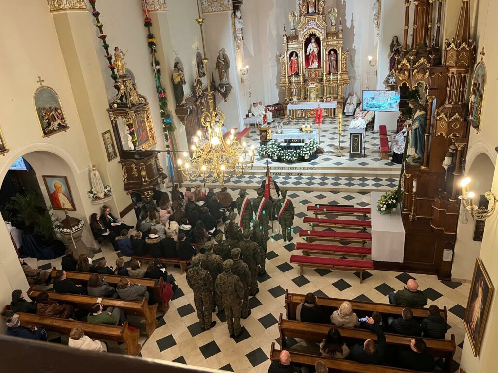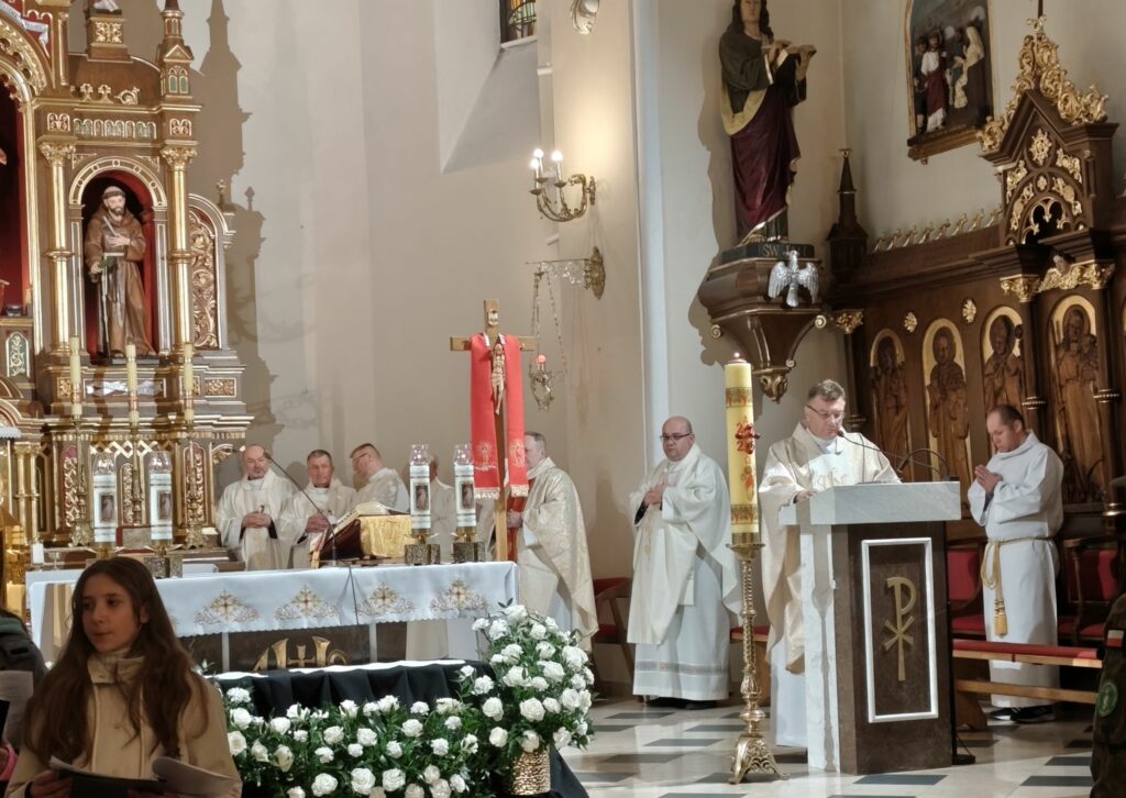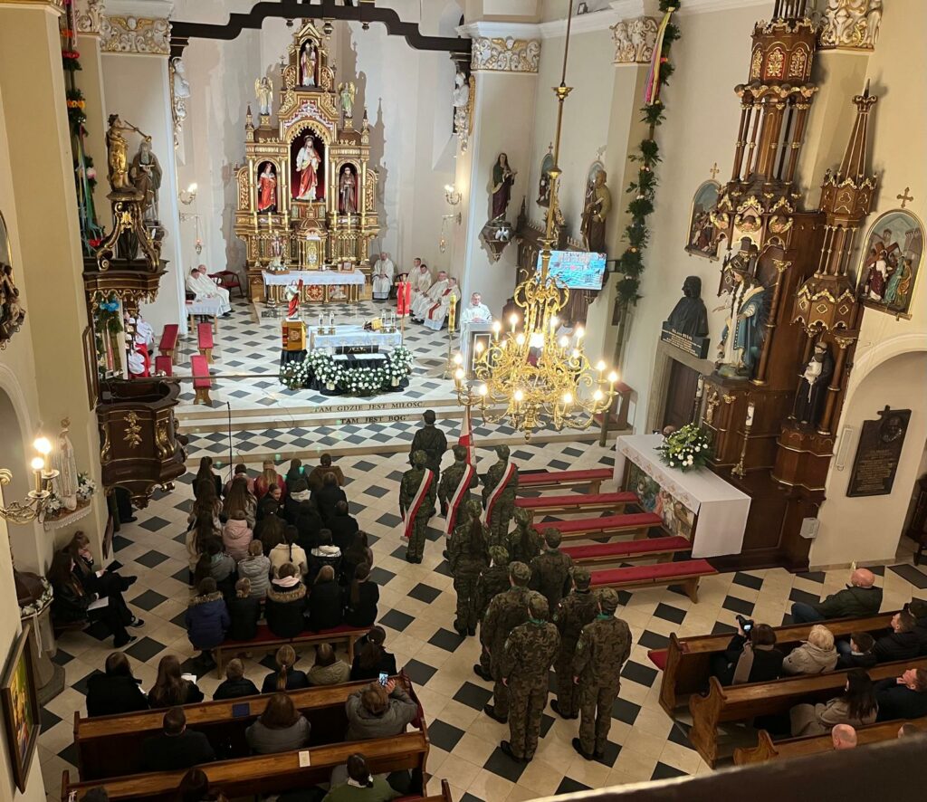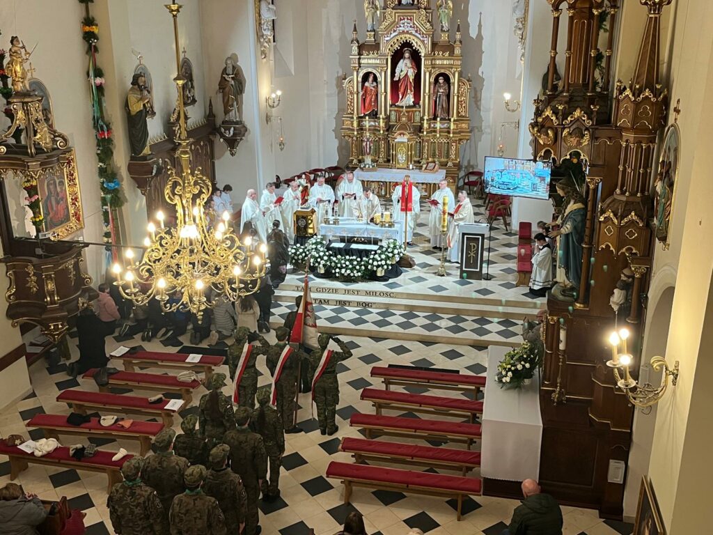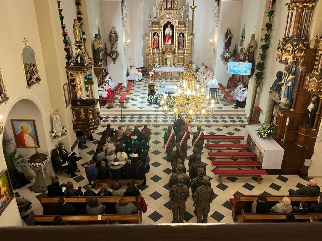 wymordowało ponad 22 tysiące polskich oficerów i funkcjonariuszy Policji Państwowej. W katyńskich dołach śmierci spoczywa wielu oficerów i policjantów, między innymi kapelani katyńscy i przedstawiciele naszej parafii: Jan Waligóra i Władysław Imiołek. Nie możemy o Nich zapomnieć! W intencji pomordowanych została odprawiona koncelebrowana msza św., której przewodniczył ks. Proboszcz Bogusław Pasierb. Celebrowali ją także: ks. kpt SG Robert Młynarczyk, ks. Józef Brzostowski, ks. płk dr Zbigniew Kępa, ks. Tomasz Majchrzak, ks. Robert Osak, ks. Piotr Klóska, ks. Jan Wąchała, ks. Mariusz Berko. Okolicznościową homilię wygłosił ks. Zbigniew Kępa, w której przybliżył zgromadzonym parafianom, gościom i młodzieży wydarzenia z 1940 roku. Nie zabrakło też przedstawicieli klasy SG z ZS w Żegocinie wraz ze sztandarem szkoły. Nabożeństwo uświetnił swoim pięknym śpiewem chór szkolny Szkoły Podstawowej im. Świętej Kingi w Żegocinie pod kierunkiem pani Anny Maurer – Pasionek. Na zakończenie ks. Proboszcz Bogusław Pasierb podziękował wszystkim zebranym za obecność i zaprosił na dalszy ciąg uroczystości poświęconej ofiarom Katynia pod Dęby katyńskie i do CKSiT w Żegocinie na film.